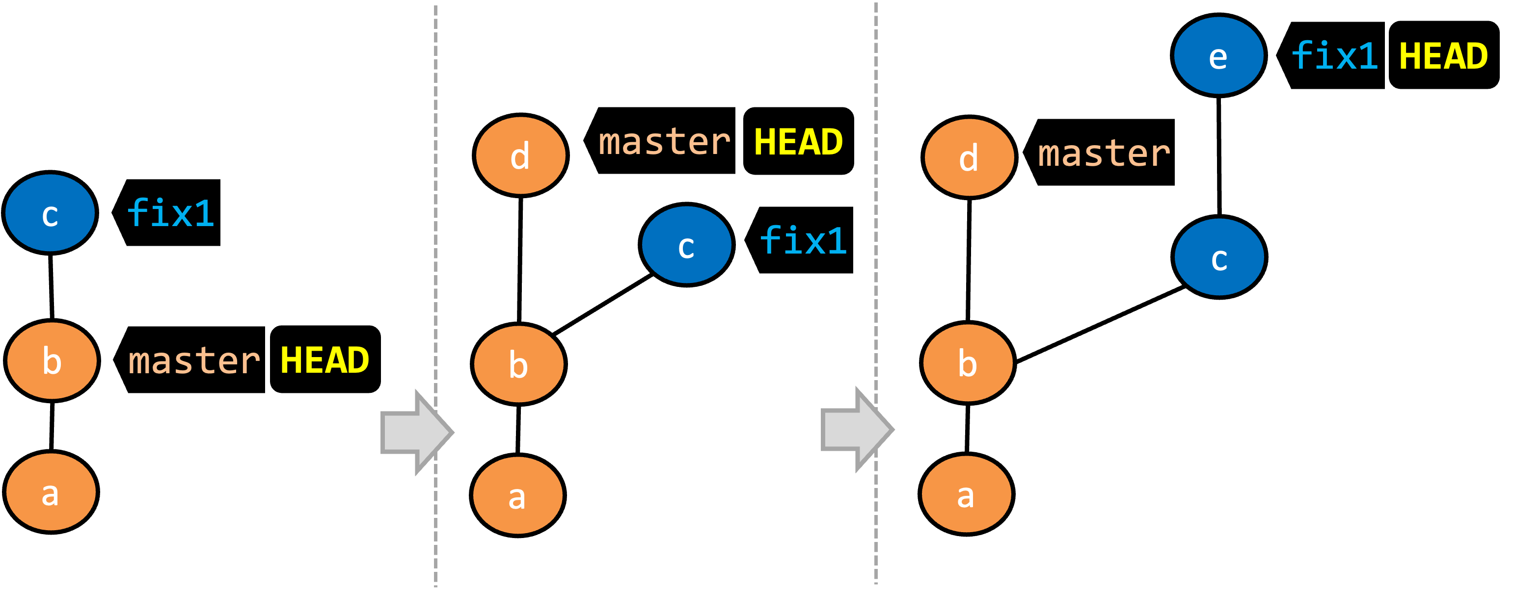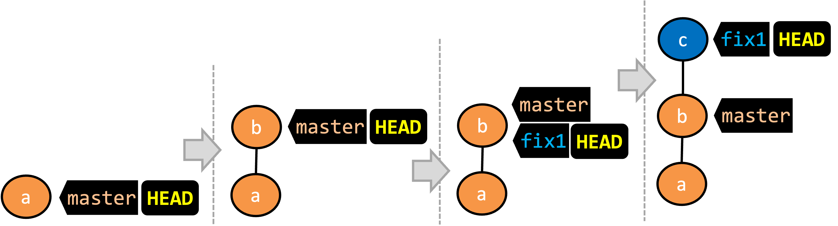 c) has been added. The current branch reffix1moves to the new commit, together with theHEADref. At this point, the repo's working directory reflects the code at commitb(notc).