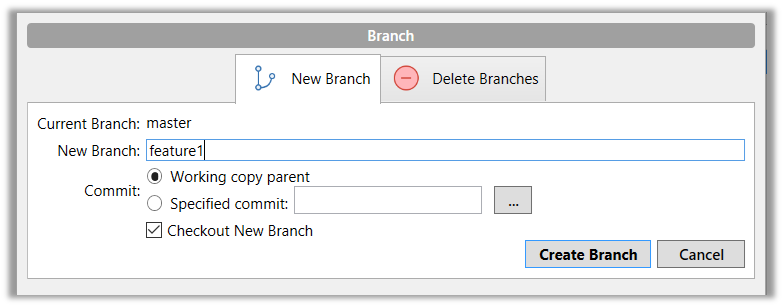 Click on the Branch button on the main menu. In the next dialog, enter the branch name and click Create Branch.