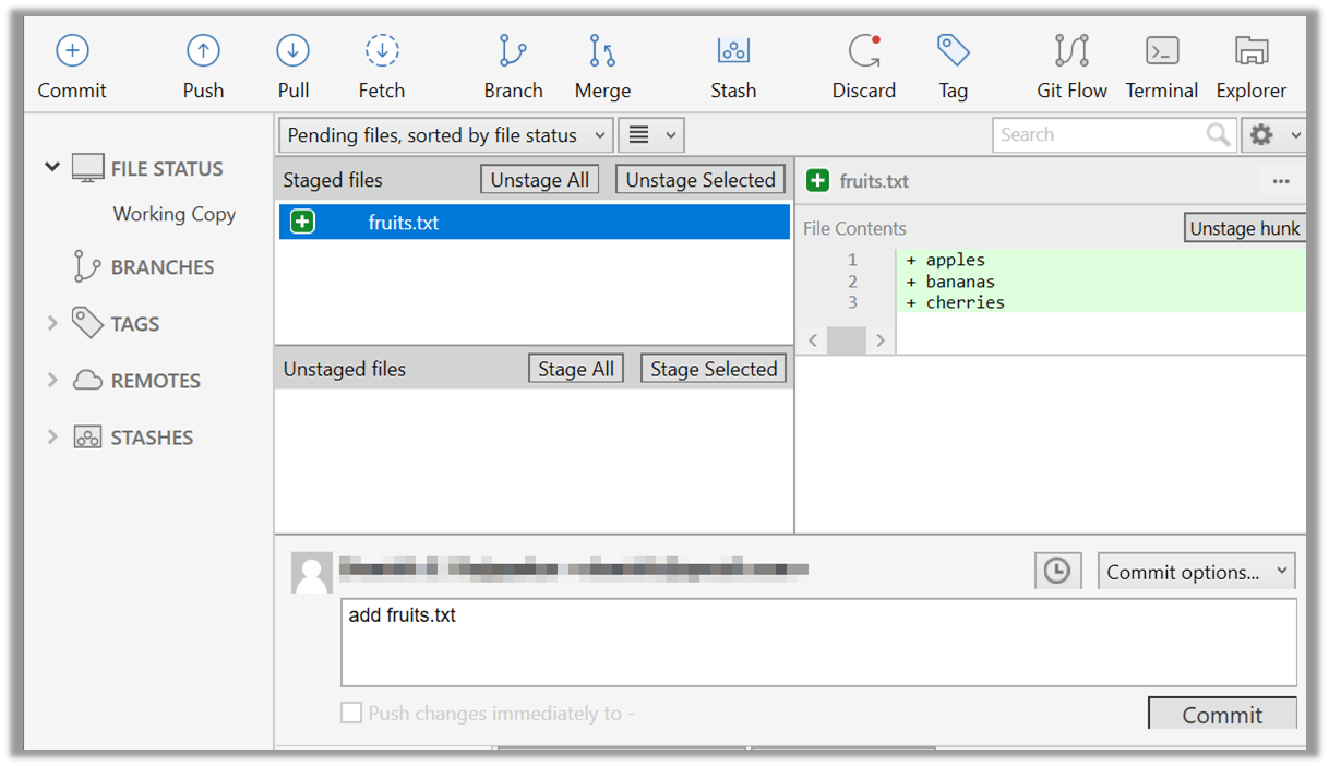 3 Enter a commit message (e.g. add fruits.txt) into the text box.