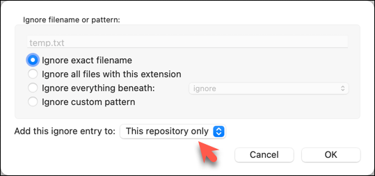A repo-specific ignore-list of files can be specified in a .gitignore file, stored in the root of the repo folder.