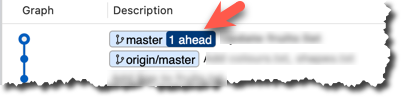 Before pushing the new commit, Sourcetree will indicate that your local branch is 'ahead' by one commit (i.e., the local branch has one new commit that is not in the corresponding branch in the remote repo).