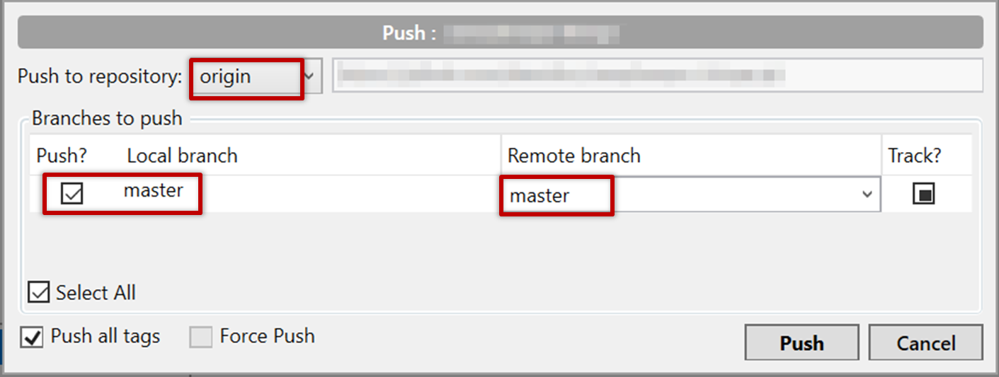To push, click the Push button on the top buttons ribbon, ensure the settings are as follows in the next dialog, and click the Push button on the dialog.