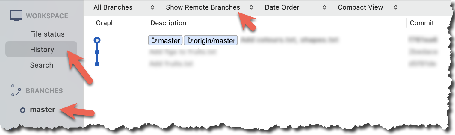 After pushing, the revision graph should look something like the following (note how both local and remote-tracking branch refs are pointing to the same commit again).