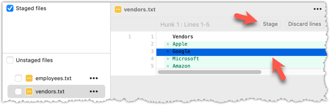 2 Stage some changes in some files while keeping other changes in the same files unstaged.